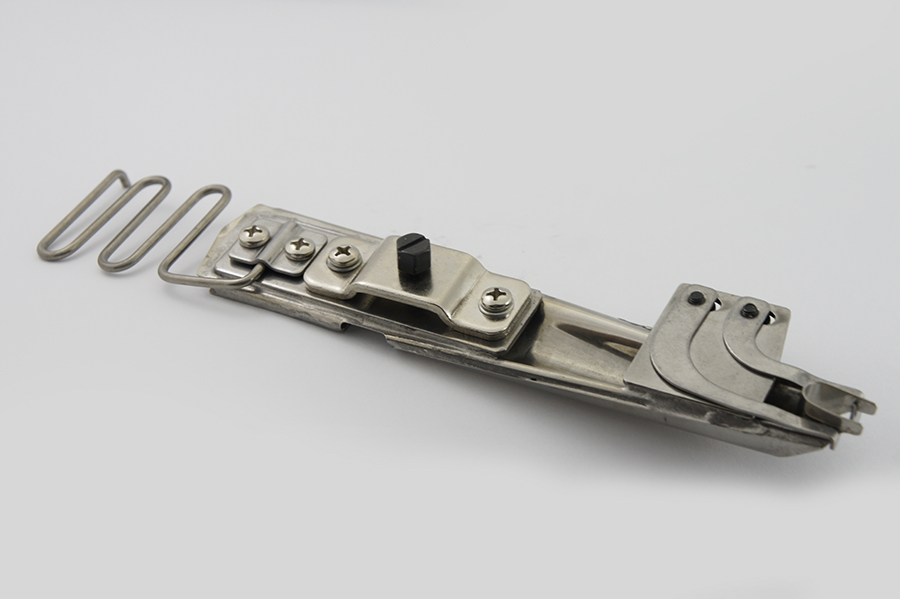 Представлений пристрій використовується для облямовування країв трикотажних тканин косою бейкою в чотири складання. В результаті ви отримуєте акуратно оброблений край з закритими зрізами.